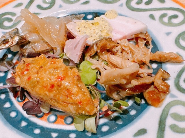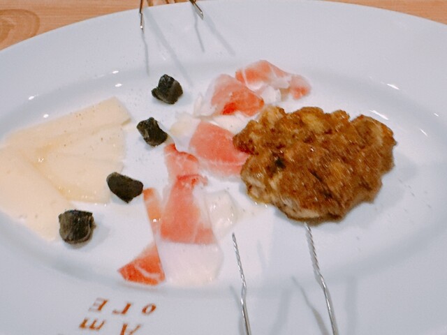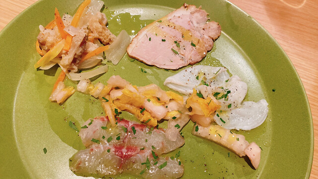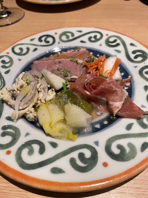 前菜のプレートは、生ハム、鴨、...