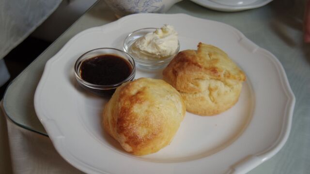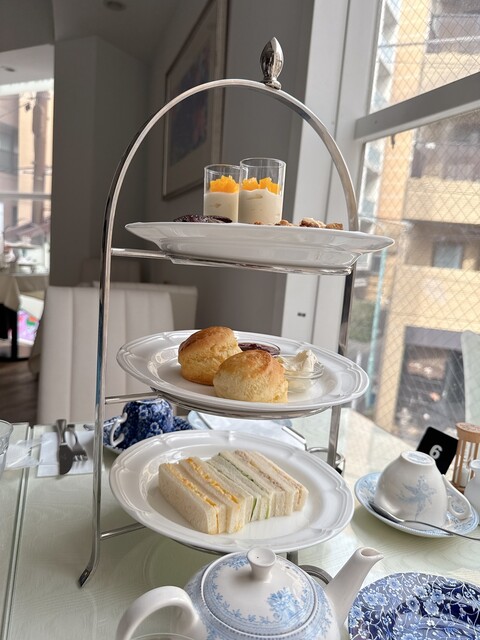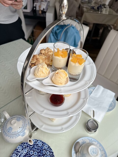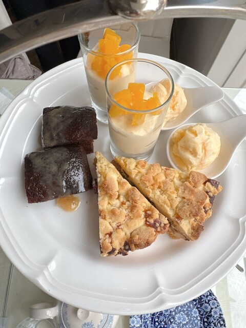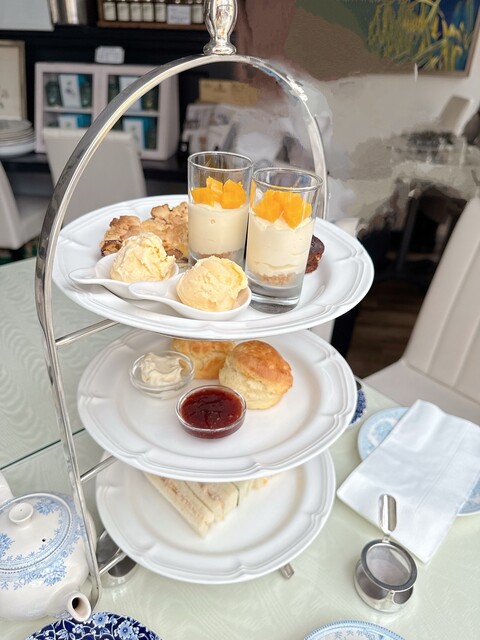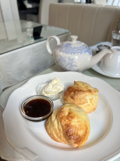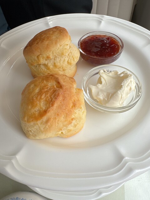 アフタヌーンティーの主役は、何と言ってもスコーン!焼きたてで外はサクッと、中はふんわり、そしてほろりとした絶妙な食感に感動しました。素朴ながらも奥深い味わいで、今まで食べたスコーンの中で一番好きかもしれません。添えられたクロテッドクリームとジャムもたっぷりで、最高の組み合わせでした。