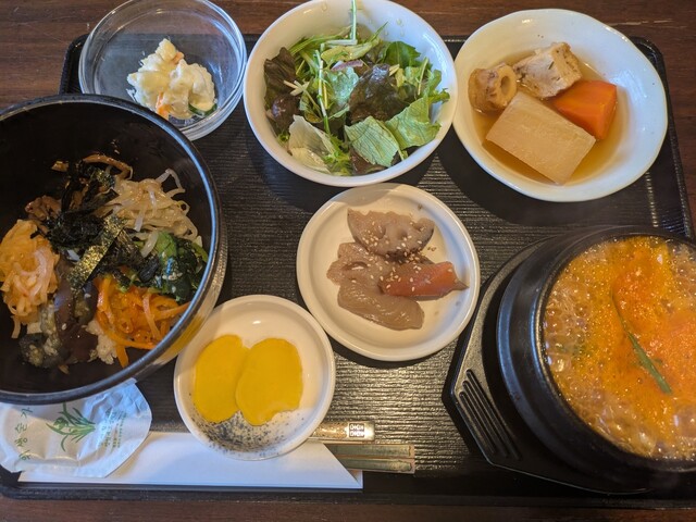 娘と食事に来ました。韓国風古民家の佇まいがとても素敵で、室内も落ち着けます。すぐ隣りで超大物噺家の方が普通に食事しておられたのには驚きました。TVでみる通りの印象の方で人柄が滲み出ていて親近感を覚えます。どうやら常連さんのようです。