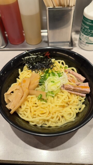 運ばれてきた、この丼。光沢のある太麺の上に、ネギ、海苔、メンマ、そしてチャーシュー。中央に少しだけタレが沈んでいる。この、汁がないという事実が、俺の闘志を煽る...