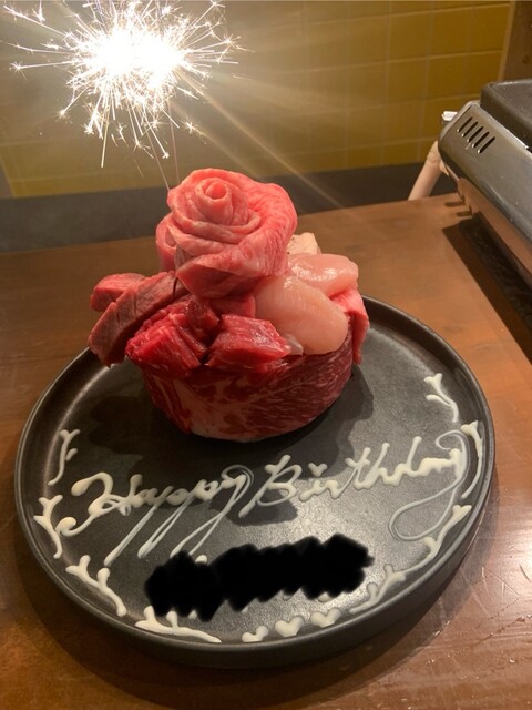 おまかせコースに慣れた方、ワンランク上のお楽しみを! シェフのお任せで13種類のお肉をご提供!! 1人焼肉、デート、パーティーなど、どんなシチュエーションにも対応できるお店。 美味しいだけではなく、楽しいお店です♪ 黒毛和牛A4ランク以上のお肉を使用 産地はその日一番良い物を仕入れております! 肉、ホルモンともに鮮度にこだわり、常に真空にしているので鮮度抜群!! 誕生日などのお祝いには無料で肉ケーキもご用意できます! ※前日までの要予約、弊社HP、もしくはお電話で予約のお客様に限ります。