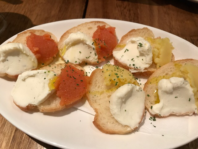 突き出しはパンにクリームチーズをのせたもので、一つはいぶりがっこ、もう一つはレバーペー...