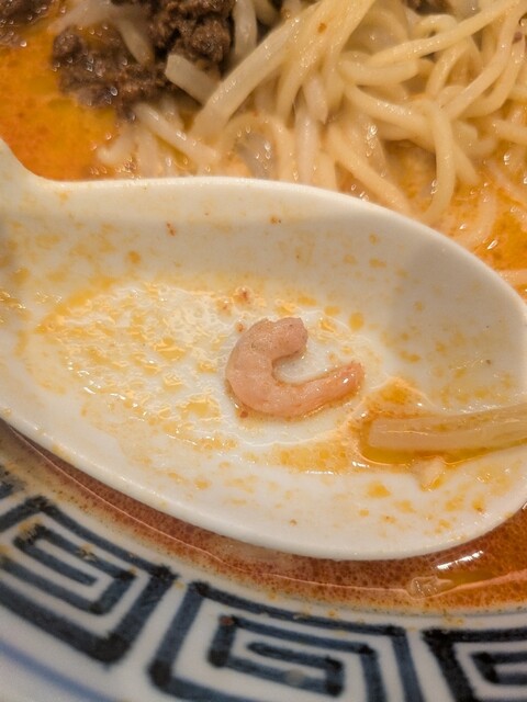 挽肉は甘く味付けされて、辛いスープとのバランスが良く、もやし、にら、きくらげ、エビも入り、もやしは多めでアツアツでシ...