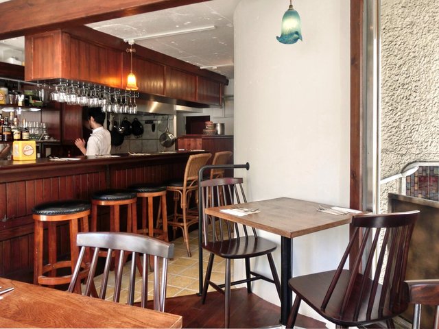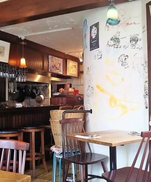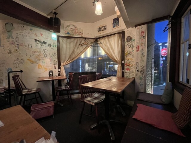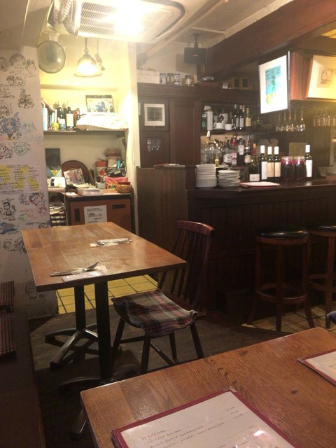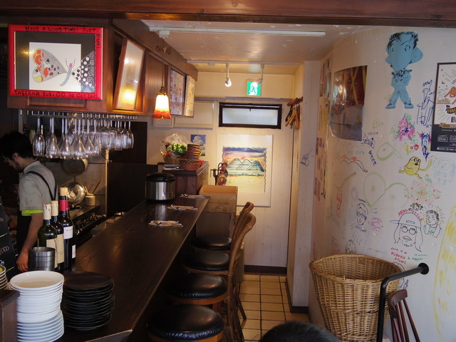 店内は三角形のこじんまりとしたアットホームな雰囲気です。壁にも似顔絵やイラストが書かれていて、スペインのバルを感じさせます。