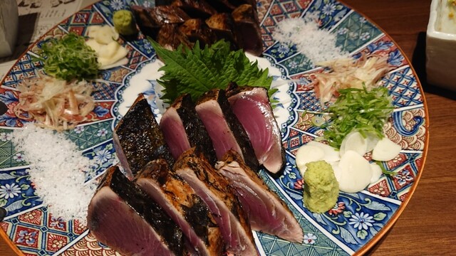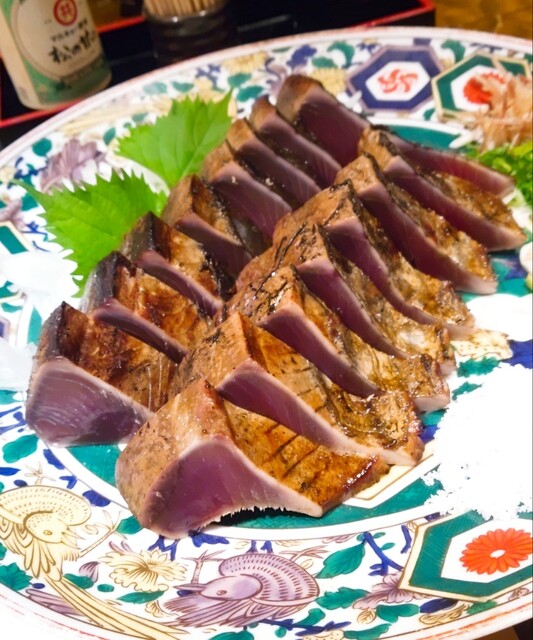 当店名物は800度から900度のとても強い藁の火力で焼き上げる「かつをの塩たたき」。藁が燃えるときに出る煙や香りによって、独特の風味が生まれるのが特徴で、塩をさっとつけて味わうのが土佐流です。