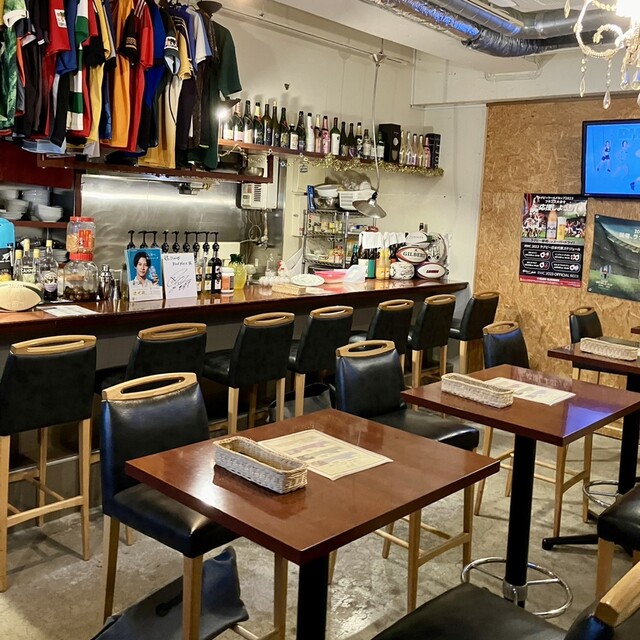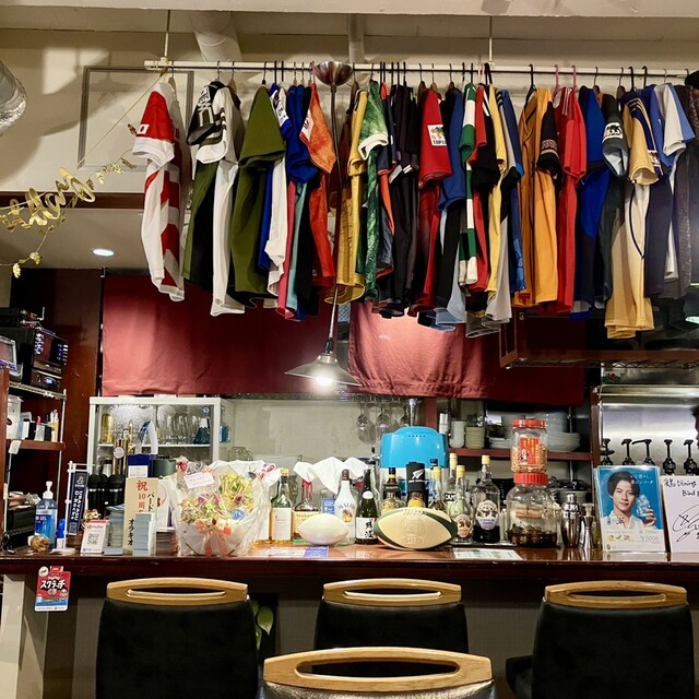 店内にはバーカウンターがあり、天井にはユニフォームが飾られていて、スポーツ好きには楽しい空間。