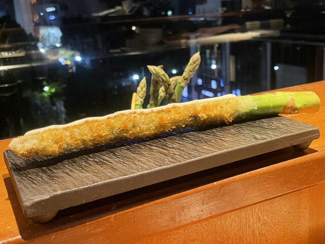 ◎エビの串揚げは味噌を感じたり、ドでかいアスパラの串揚げなど、ひと捻り効いたおいしい串揚げがいただける。