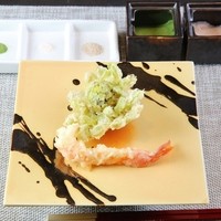 どちらのコースにも入っていない、当店だけのお楽しみの特別変わり揚げ、6年育ちの高麗人参が入ってます。 海老がお好きな方は、なんと活車海老が 4本!!