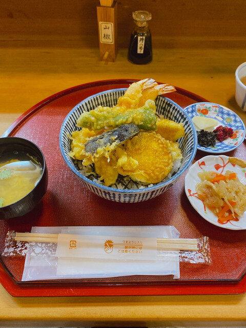 ランチメニューは、天丼、天ぷら定食、銀鱈西京焼があり、12:45から親子丼が提供になる。