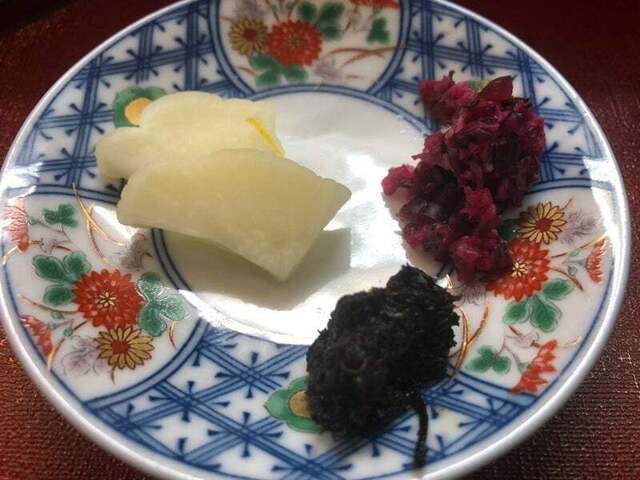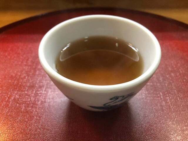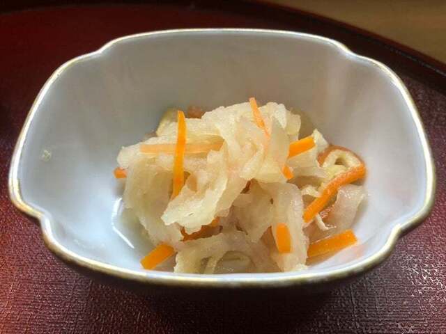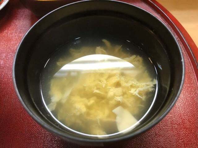 銀鱈西京焼には昆布の漬物が添えられていて、ご飯、すまし汁、だし巻き卵、黒い...