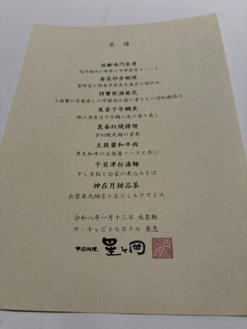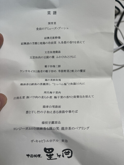首相官邸前のこのホテルは昔はヒルトン今は東急キャピタルとなります。星ヶ丘のランチコースはかなりの量です。前菜盛りも美しく、点心もしっかりあるし、丁寧なお料理は卵スープにも干し海老が主張します。プリフィ...