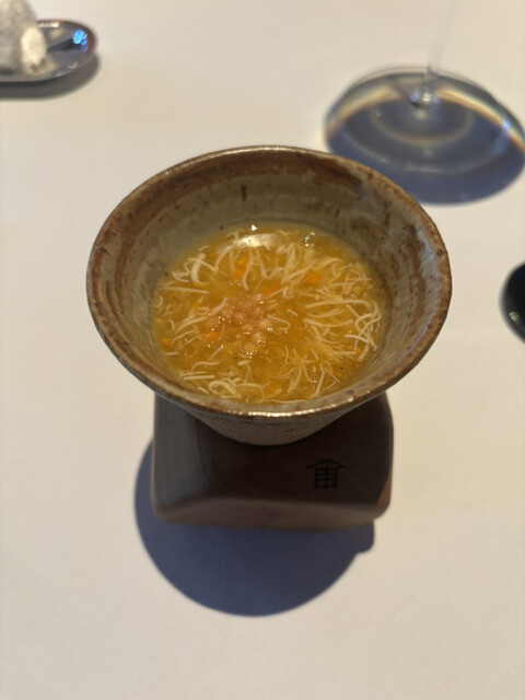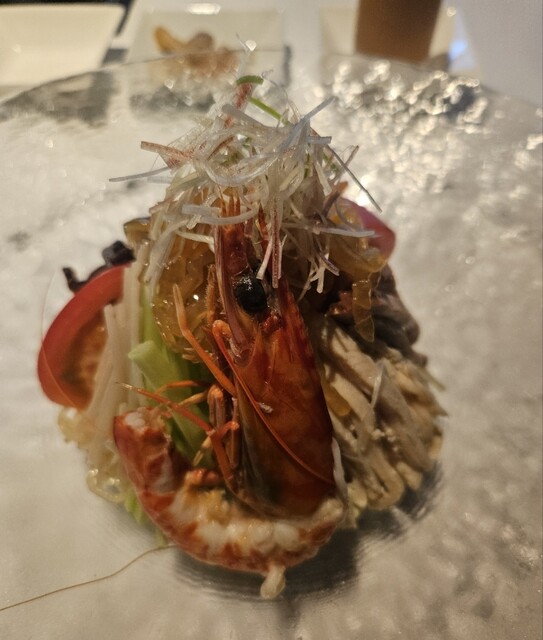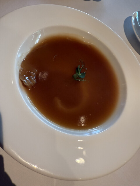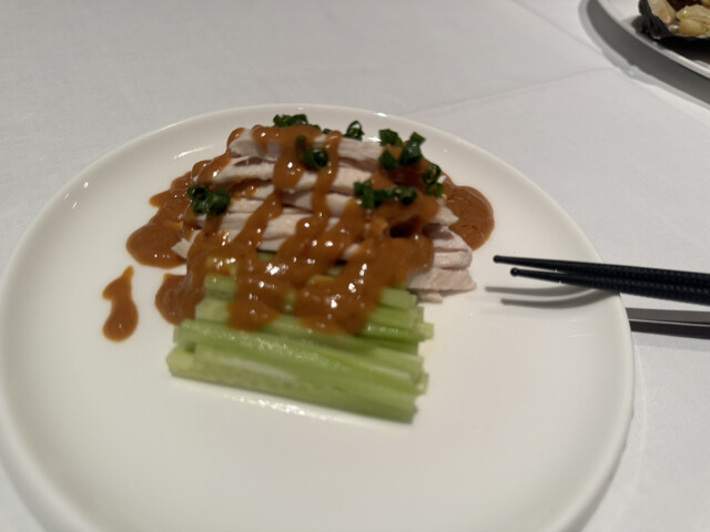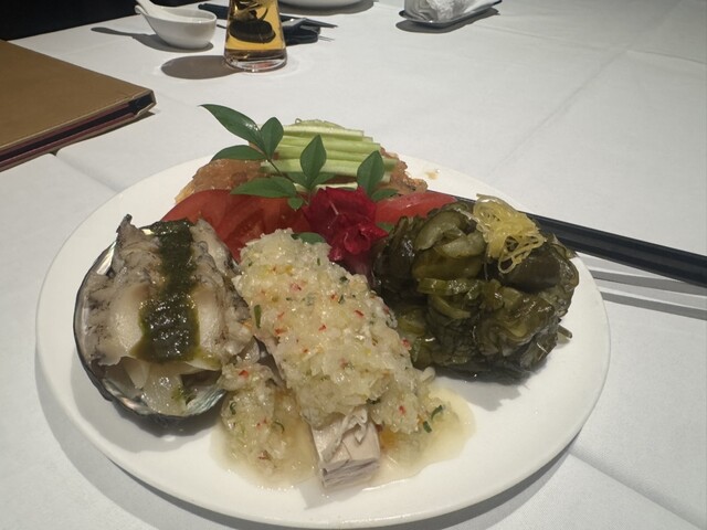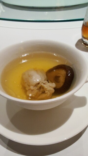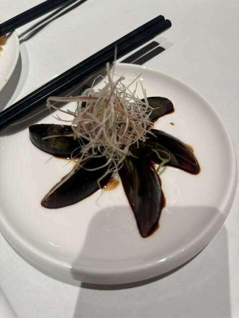 本日も素晴らしいお食事でした。今日いただいたのは食前アミューズブッシュ、美味しいあさりでした。そして、次は、紹興酒の芳醇と地鶏の冷前菜、九条ネギの香りをそえたもの、これが最高でした