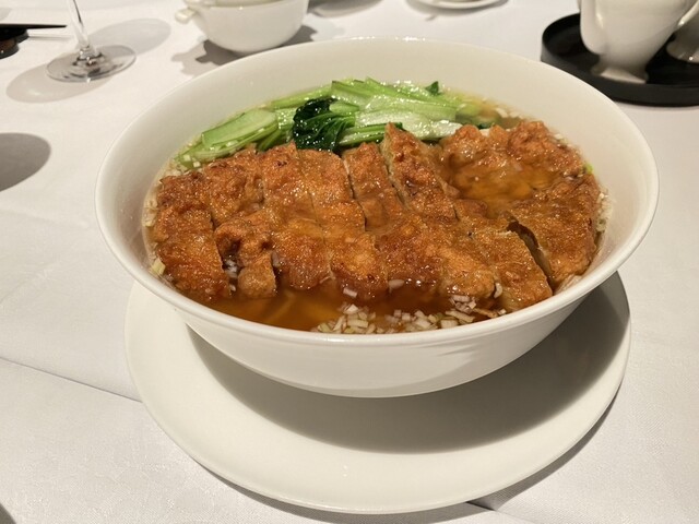 高級ホテルのランチ。アラカルト可。星ヶ岡スタイルとあるが、いたって普通の中華スープに並のパーコー。麺もとくにこだわりのない中華麺といったよくある普通の美味しいパーコーメン。コスパは悪め。