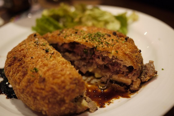 黒毛和牛のステーキ、アンティーク家具やビールグラスに囲まれた店内