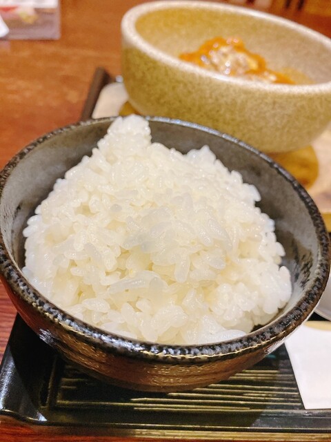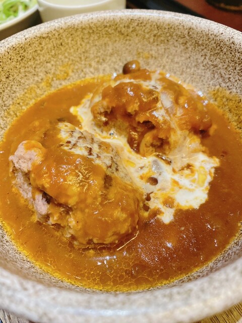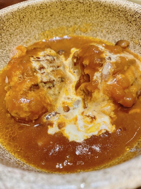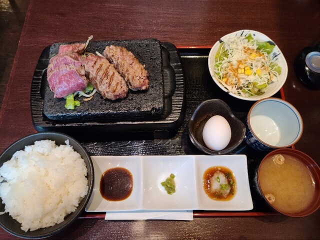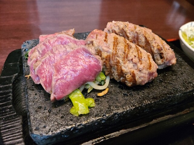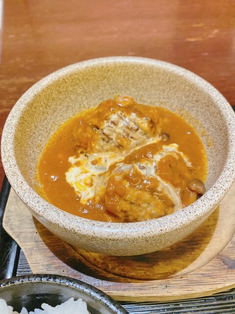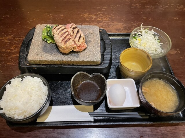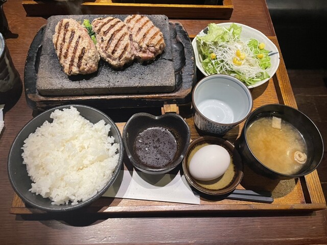「ただ、ハンバーグが食べたい」という大きなのろし。 霞ヶ関ビルお隣の霞ダイニング2階、 焼酎が売りの居酒屋のランチタイム。 系列店数店でこのハンバーグ専門店を展開しているとのこと。 落ち着いた店内には、ハンバーグを焼いた香ばしさ漂う。 匂いからして、期待持てるな。 80㌘俵型×2個、熱々の溶岩石の上に鎮座。 ご飯、お味噌汁、生たまごとミニサラダも付く。 これで1200円はお得感... 詳細を見る