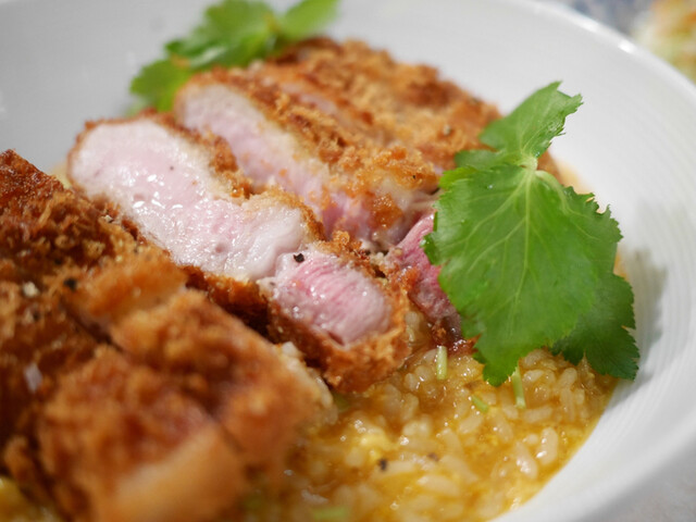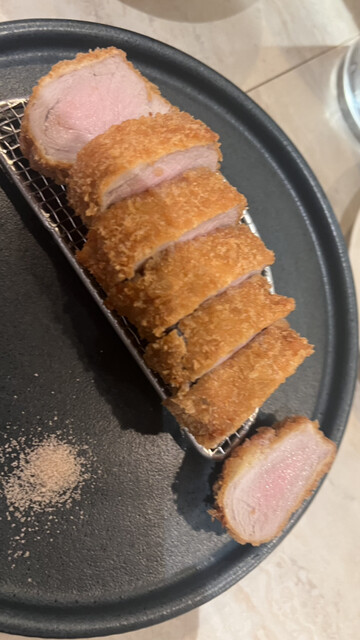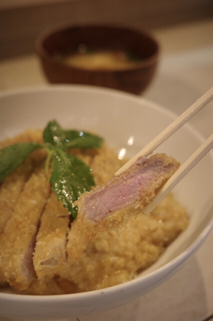 カツは定食と同じもので、厚切りで普通の硬さ。玉子でとじられておらず、代わりに塩が乗っているので、カツとご飯を別に食べるスタイルです。お好みでオリーブオイルや醤油を使うよう勧められましたが...