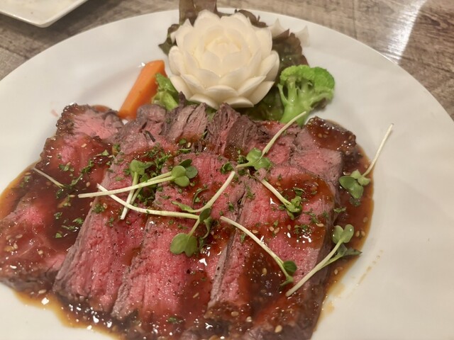 こだわりの赤身肉をじっくりと焼き上げ、丁寧にスライスしました。自家製赤ワインソースとご一緒に。会社の忘年会・新年会・合コンなどにもおすすめです♪