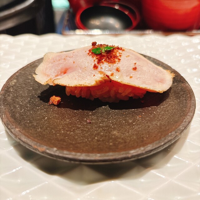 鳥わさの炙り握り寿司は醤油パウダーとワサビオイルで。