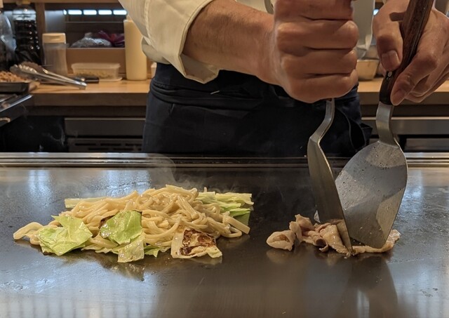 季節のお野菜や魚介類、信州和牛などをシンプルに鉄板焼きで調理いたします。その素材に合ったソースは和洋折衷でご用意。お食事のシメには大阪から取り寄せた地ソースで仕上げる本場の「お好み焼き」「焼きそば」をご用意しております。
