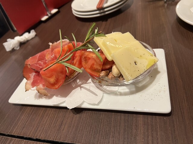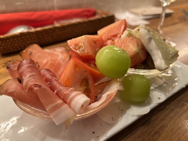 前菜の盛り合わせ。生ハム、トマト、ナッツにチーズ。なかなか独創的なプレゼンです。