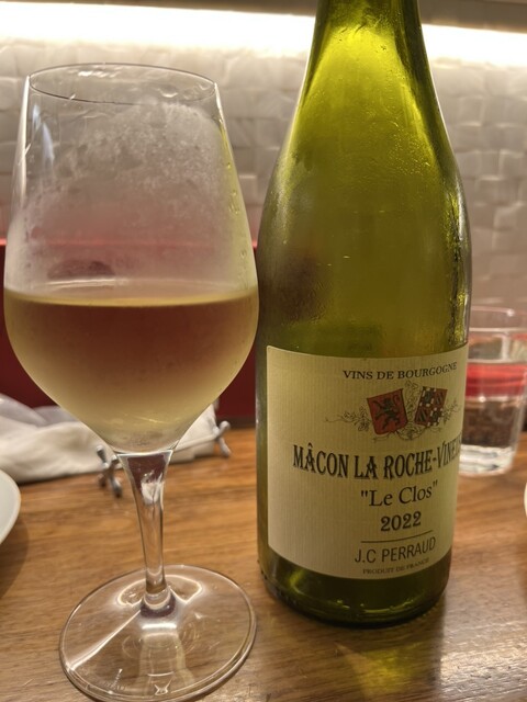 ブルゴーニュのシャルドネ、Mâcon La Roche-Vineuse “Le Clos”をグラスでいただきました。おすすめのワインとあって、程よく調和した樽の香りと余韻が素敵です。