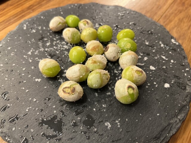 アペリティフの銀杏。塩味が効いていて美味しいし、スレートプレートで出てくるのが素敵です。