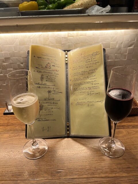 エントランスから、シェフの手書きと思われるイラスト付きのメニューがディスプレイされていて、ライトアップも落ち着いた暖色系でとてもオシャレ。