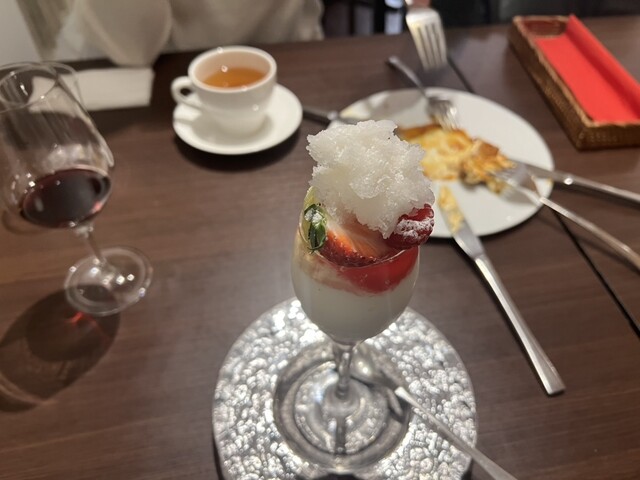 季節のグラスデザート。白ワインのソルベの下に、フレッシュなフルーツ、白ワインジュレ、パンナコッタ、そしてフランボワーズソース。