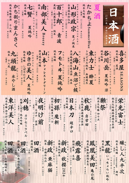 | ドリンク | 日本酒あり、焼酎あり、ワインあり、カクテルあり、日本酒にこだわる、焼酎にこだわる、ワインにこだわる |