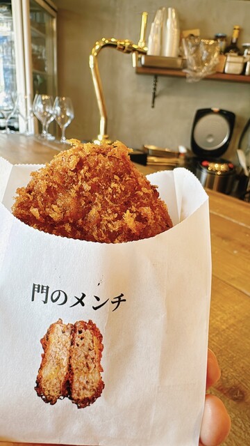 熊本県産“菊池源吾牛”を使用した、サクサクジューシーな「メンチカツ」が自慢の【菊池源吾牛 門】。メンチカツと相性の良いワインやビールなどのお酒もございますので、昼飲みにもおすすめです!カフェのような雰囲気の店内には、カウンター3席とテーブル4席・外のカウンターも有。夜はナチュールワインがメインのお店に変身します。お一人様はもちろん貸切も対応いたします。テイクアウトも可能です。ぜひお立ち寄りください...!