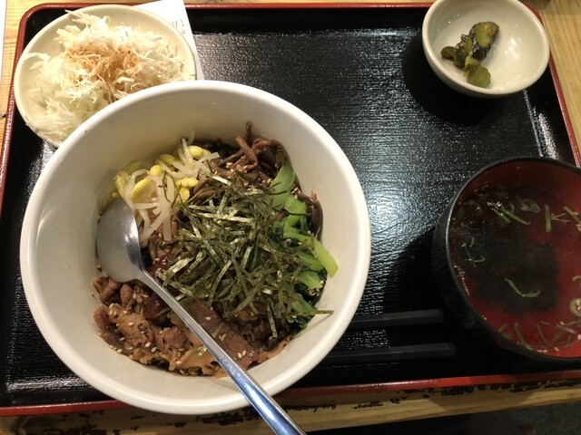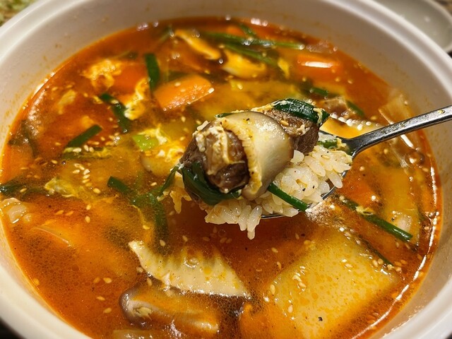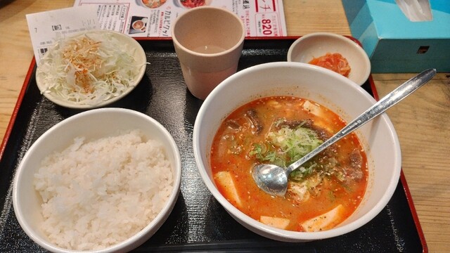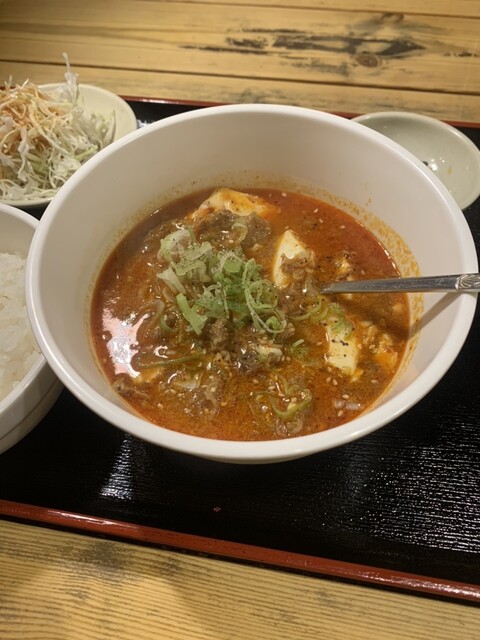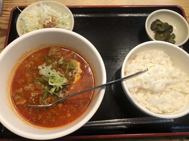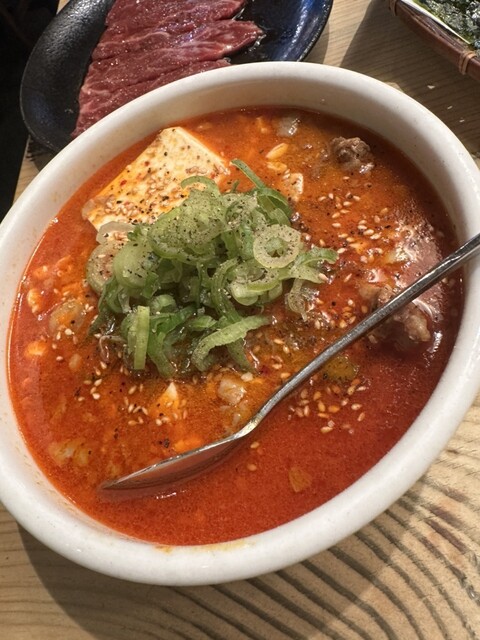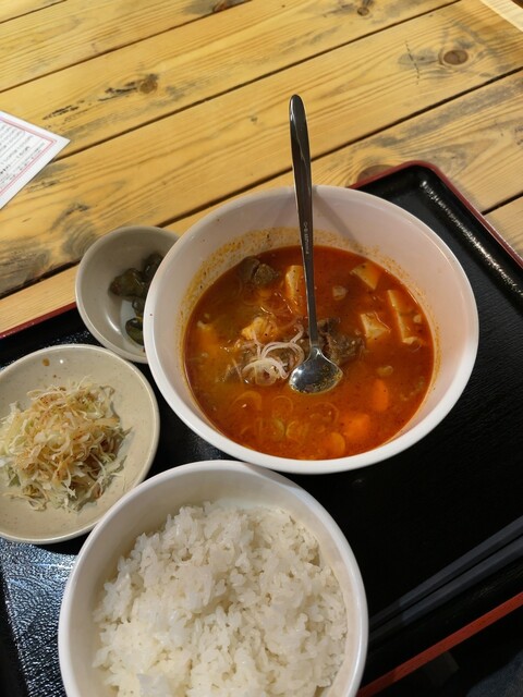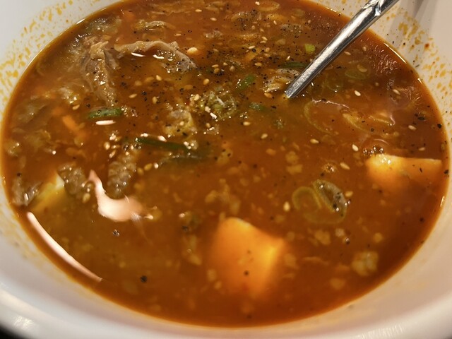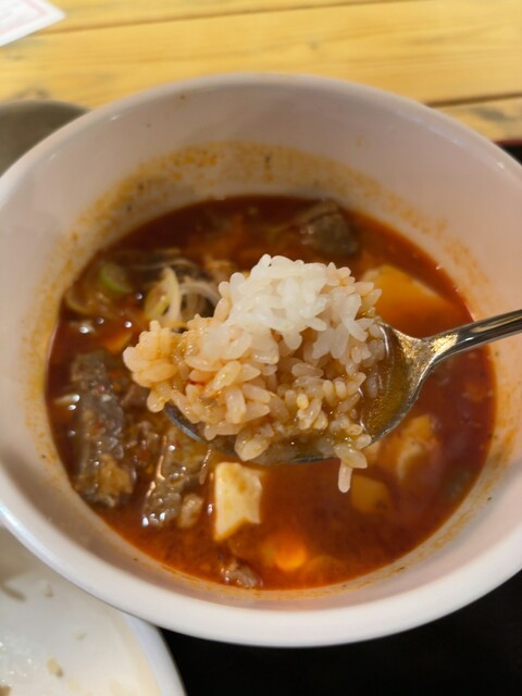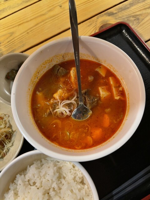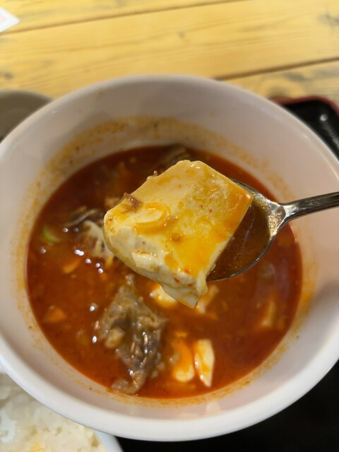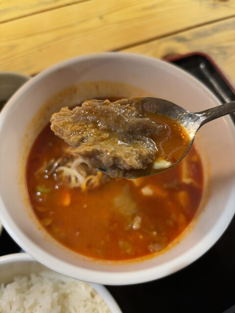 牛すじ煮込み定食(900円)を注文すると、ほどなくして提供。赤みのある見た目ながら辛さは控えめで、甘旨辛といった印象です。スープにはしっかりとしたコクと深みがあり、丁寧に仕込まれていることが伝わってきます。