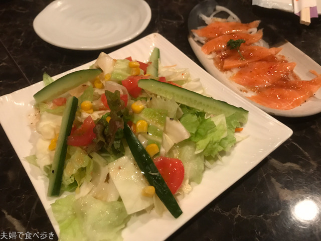 サーモンのカルパッチョ、いろんな野菜のサラダ、唐揚げなど、居酒屋定番メニュー。