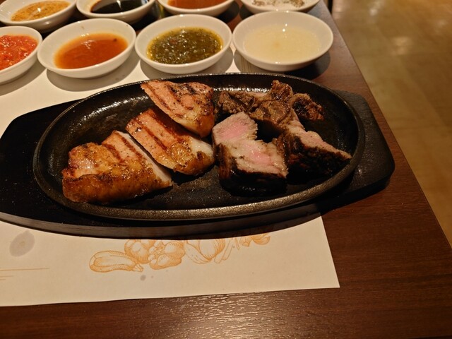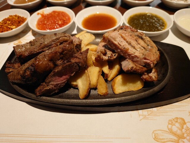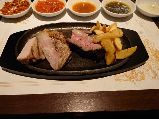 最初の一皿、牛肉(葡萄牛など)・豚肉(梅里豚・緑茶豚・田原ポークなど)それぞれ120gづつ、計240g+フライドポテトが提供されます。(お肉の銘柄は仕入れ状況によって変わる) ... 詳細を見る