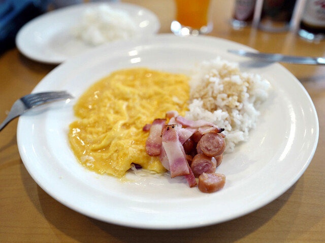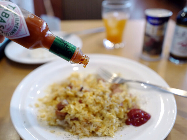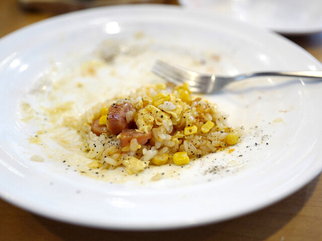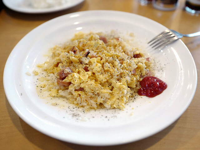 ガストで朝。今日もお皿の上で焼き飯風のご飯を作ろうと企んできた。