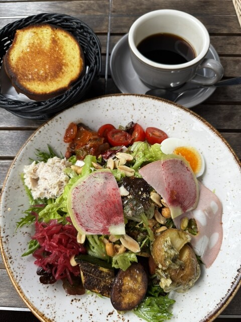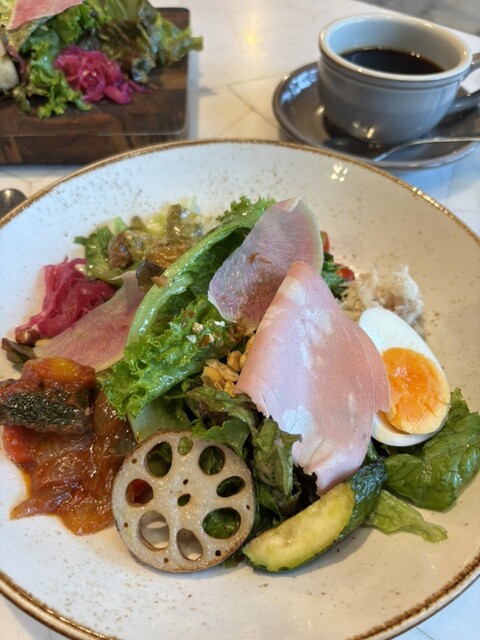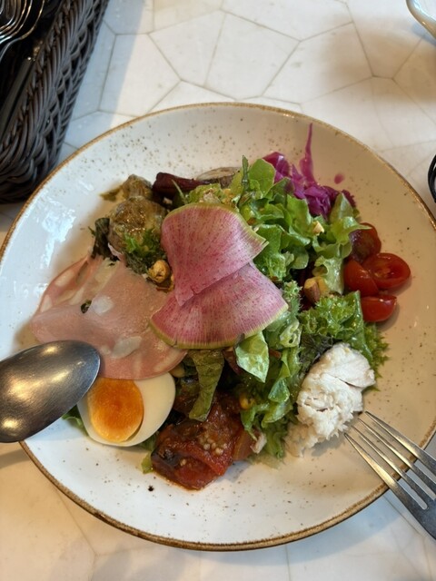 有機野菜だというグリーンサラダや半熟卵、ツナ、...