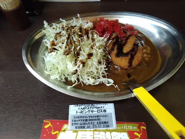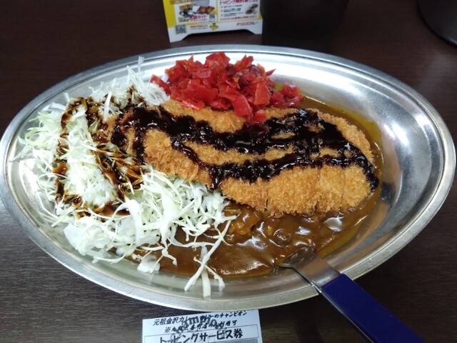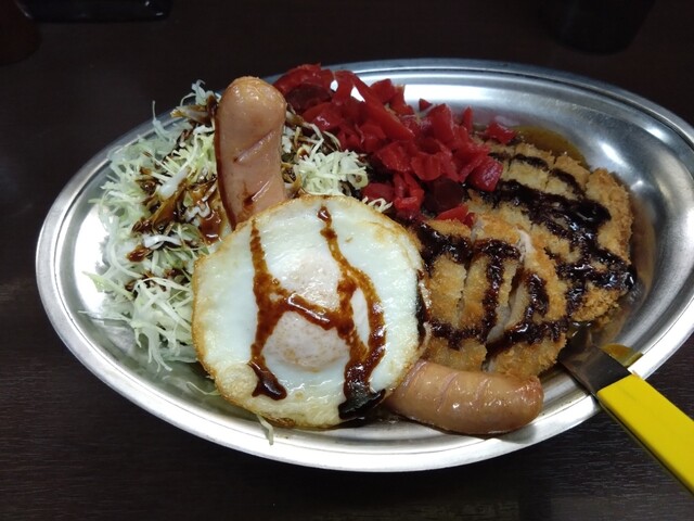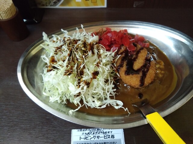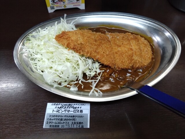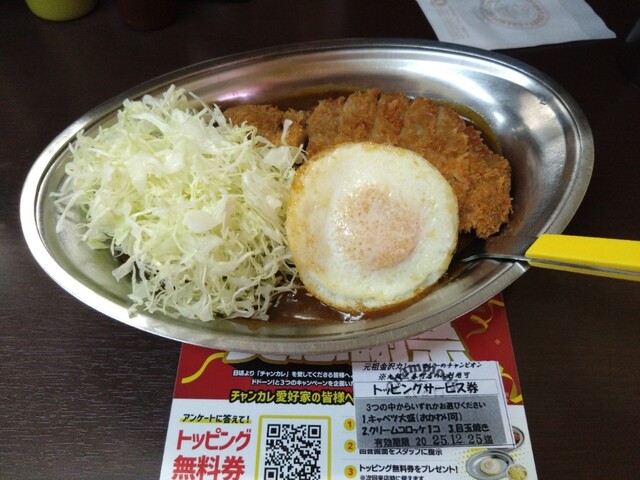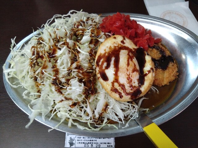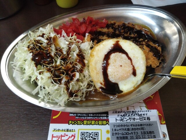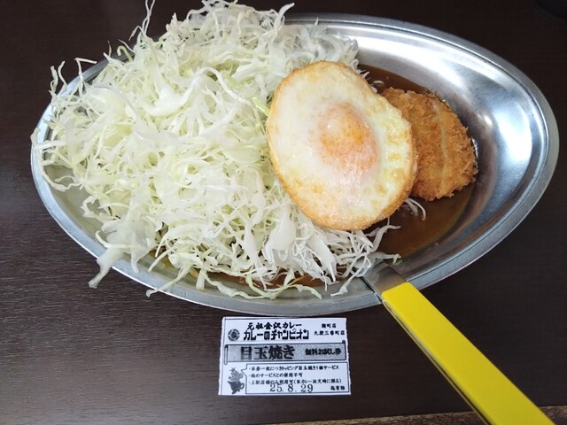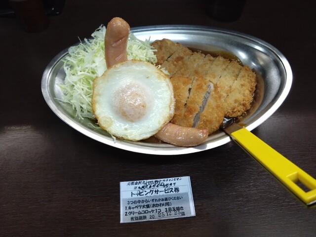 Mカツ、ヒレカツ、ソーセージの乗った、 カツカレー・ミックスに、サービス券で、 目玉焼きをトッピング。 サービス券は、 1、キャベツの千切りの大盛り(おかわり可)... 詳細を見る