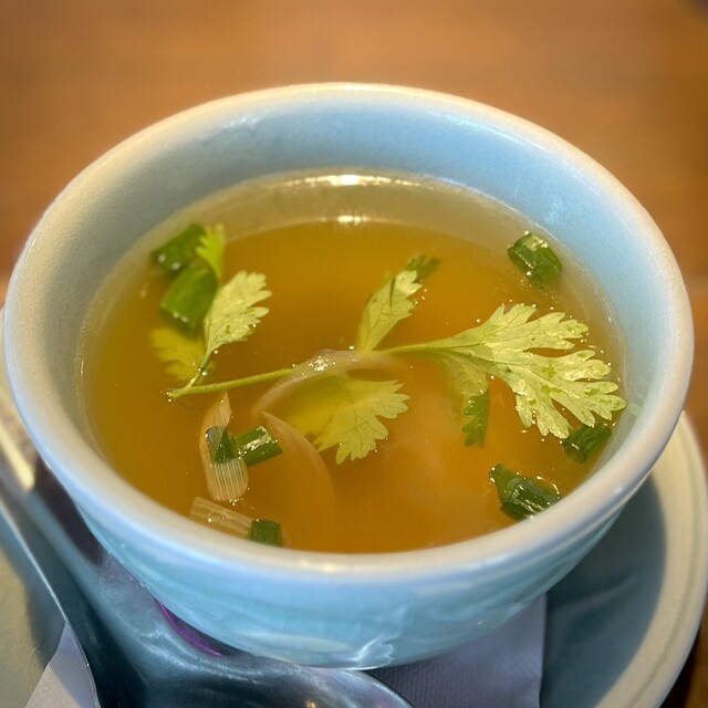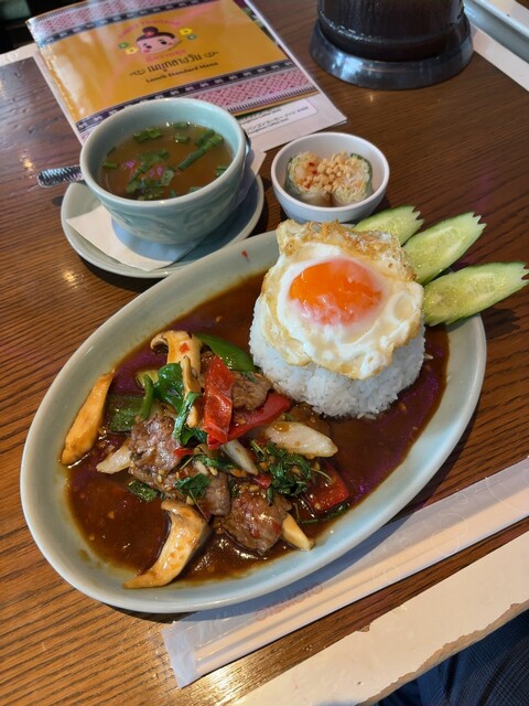 広い店内には先客が5名ほど。カウンター席に座り、ランチメニューから「ガイ・パット・バイガパオ・ラート・カオ」(1,400円)を注文しました。セットのスープは「辛い」方を選びました。