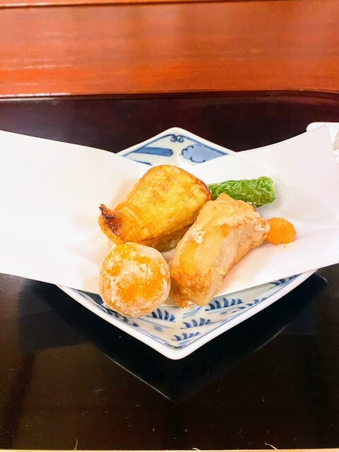 どの料理も板前の腕は確かで、食材の良さと相まって文句ありませんが、今回特に椀物の中のハタの唐揚げ、揚げ物の海老芋に蟹真丈を載せて揚げ物...