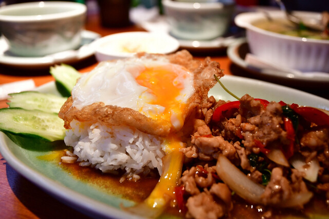 猛暑の土曜日13:53、今日は揚げ焼きのカリッカリのタイの目玉焼きが無性に食べたくなって参りました。なので、注文は、ガイ・パット・バイガパオ・ラート・カオ(鶏挽肉のバジル炒め)14... 詳細を見る