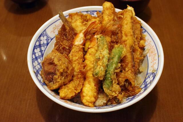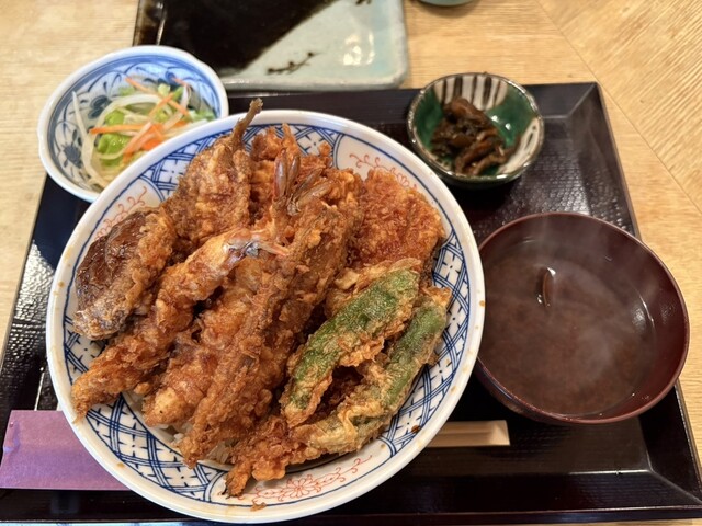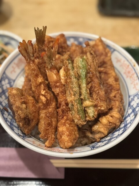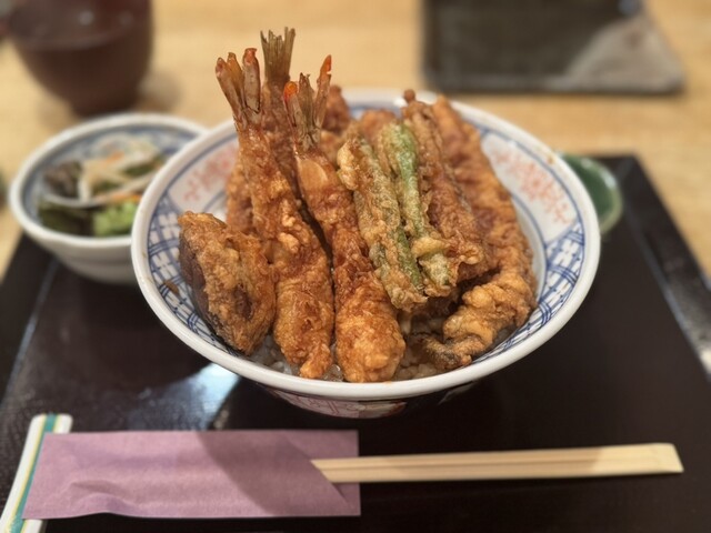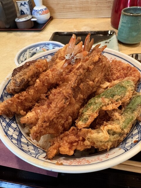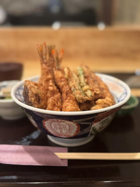 特製天丼には、海老2本、獅子唐と海老入りしいたけの野菜2種、鱚と穴子の魚2種、そして海老だけで作られたかきあげがドンッ。海老多めのラインナップは海老好きにはたまらず、個人的には...