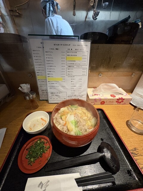 営業終了間際に行っても、外で少し並びました。ランチメニューはとてもシンプルで、豚肉とキャベツのスープうどんを選びました。スープの味は深みがありましたが、少し塩辛く感じました。うどんはコシがあって香りも...