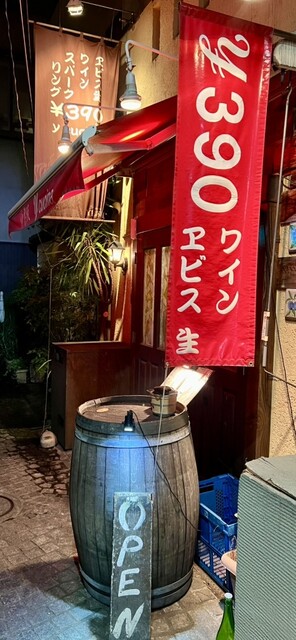 神楽坂通りから毘沙門天とUFJ銀行の間の道に曲がり、20秒程で右に入れる石畳の小道があります。その突き当たりにある「エビス390円!」の目印が当店です