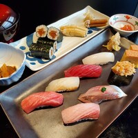 昼限定のコースです。 先付け、季節のお刺身2点、一品料理、握り10貫、巻物、お椀に季節のフルーツがついております。