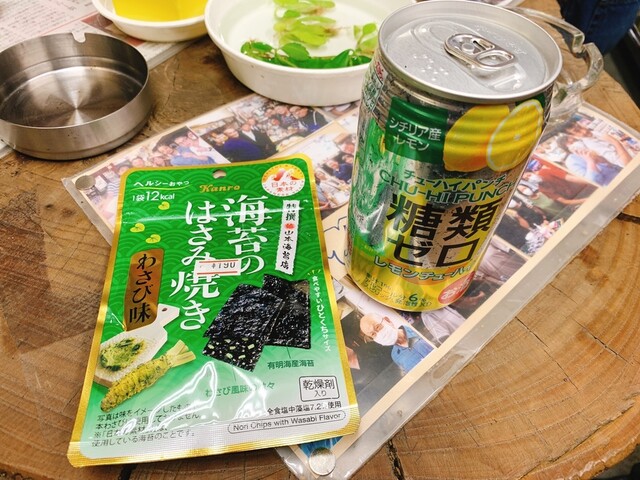 冷蔵庫の中にあるお酒と、レジで販売されているオツマミをキャッシュオンで支払って、自陣のスペースで楽しむスタイルでした。