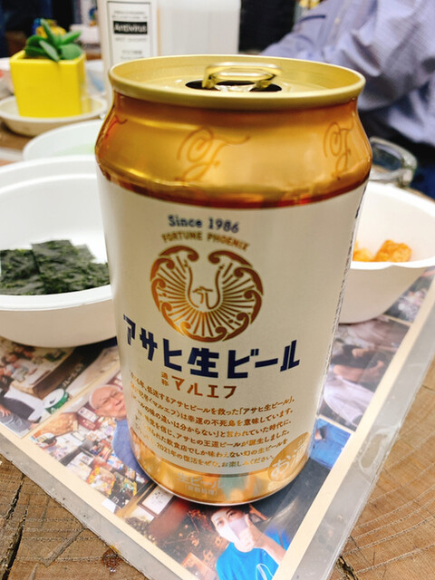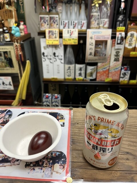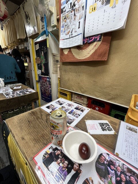 入口からすぐ立ち飲みスペースが奥までテーブル3つほどあり、常連の方々でいっぱいでしたが、店主と女将さんの愛のあるアテンドで案内いただきました。