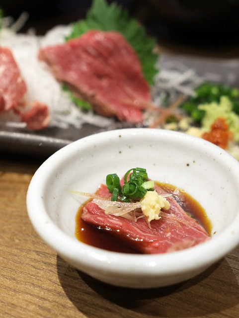 肉寿司とは… 読んで字のごとくシャリの上に肉を載せた握り寿司。 馬や牛をはじめ、鶏、鴨肉と手軽にいろんな肉を楽しめます。 名物「さしとろ」は必食!特に生で召し上がれる馬肉寿司は絶品。 神楽坂肉寿司名物“さしとろ”は是非御賞味ください。