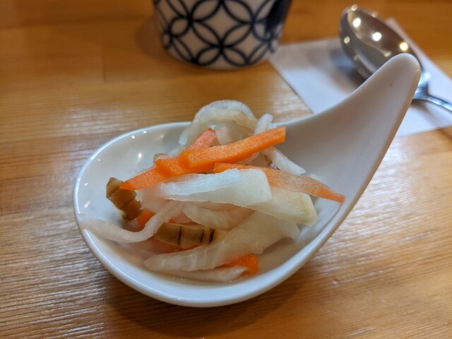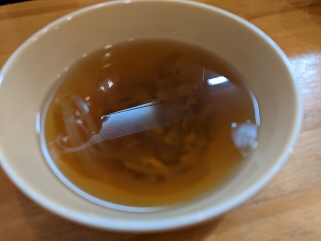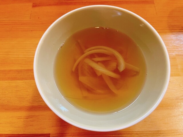 セットには、薬膳カレーと、汁物、お漬物、アイスコーヒーで、この日の汁物はオニオンスープ、お漬物は根菜のピクルスでした。