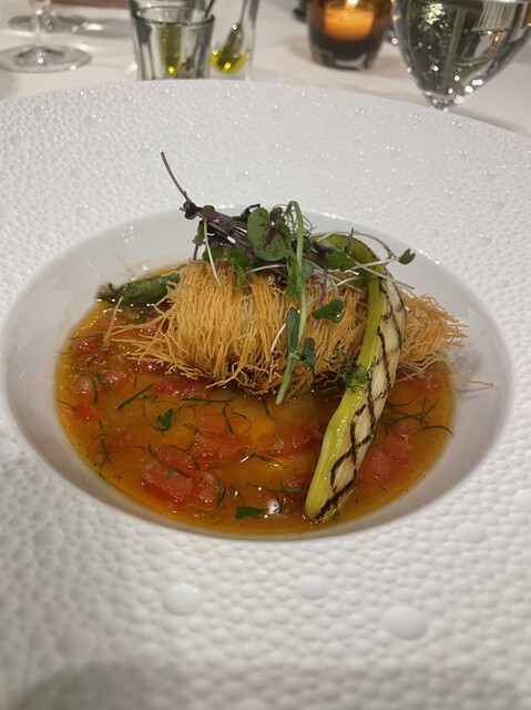 サッパリとした白身魚にガタイフの食感が楽しいですね。トマトと柑橘系ソースが美味しい。