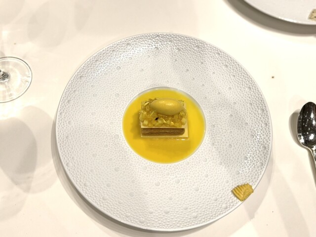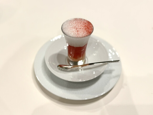 ズワイ蟹や車海老、サーモンを合わせたタルタルは、フランボワーズのヴィネグレットで爽やかに仕上がっていて、最初からテンションが上がります。魚料理は日本海スズキと北海道産帆立貝をポワレにし、トマトやオレンジ、ソースヴェルジュで軽やかな酸味がアクセント。途中でいただくシャンパーニュのグラニテも心地よいリセットになりました。