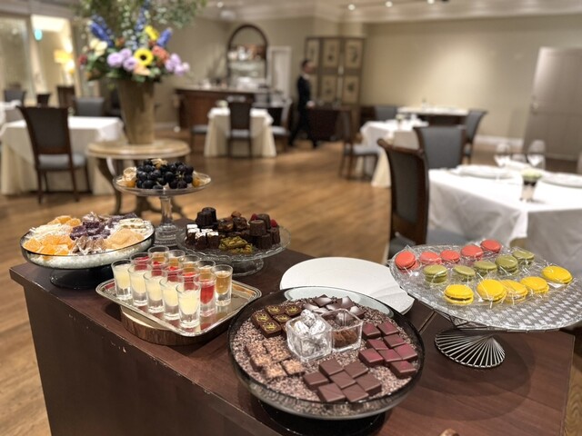 さらにデザートワゴンは圧巻で、20種類近くある中から選ぶ楽しさもありました。特に燻製チョコは忘れられない美味しさ。